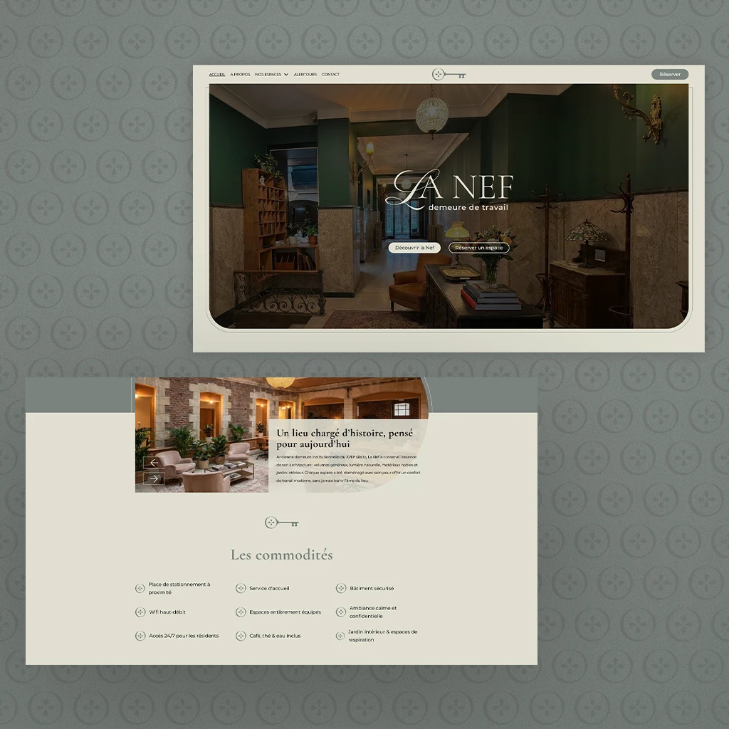 Le site internet la-nef.fr a été pensé comme le reflet digital de l’expérience physique : sobre, lumineux et structuré. L’enjeu technique principal était de concilier une présentation immersive des espaces (bureaux, orangerie, salles de réunion) avec un parcours de conversion efficace.