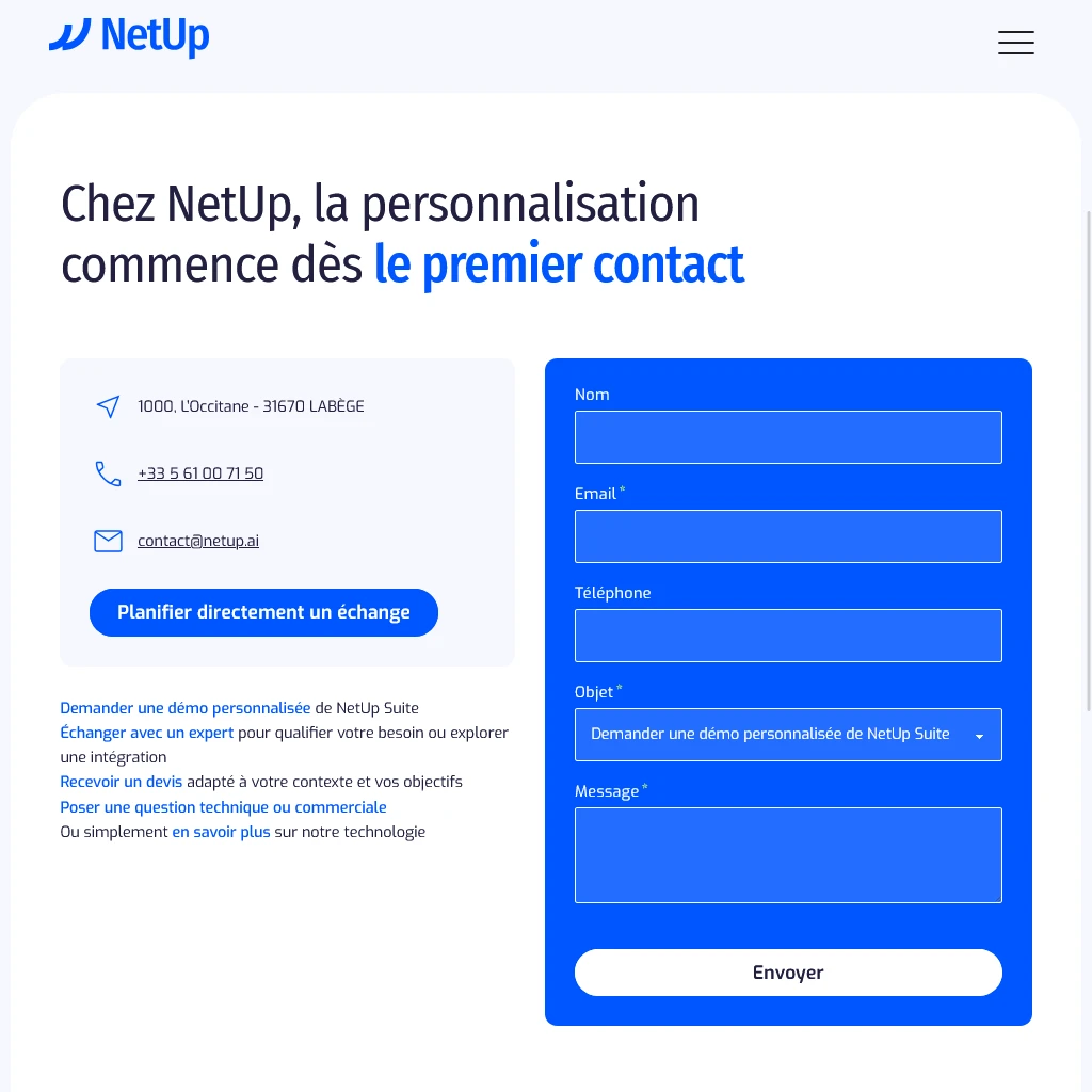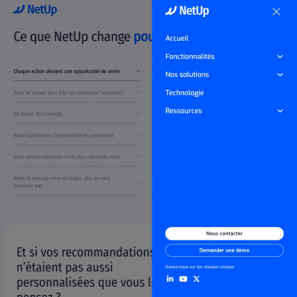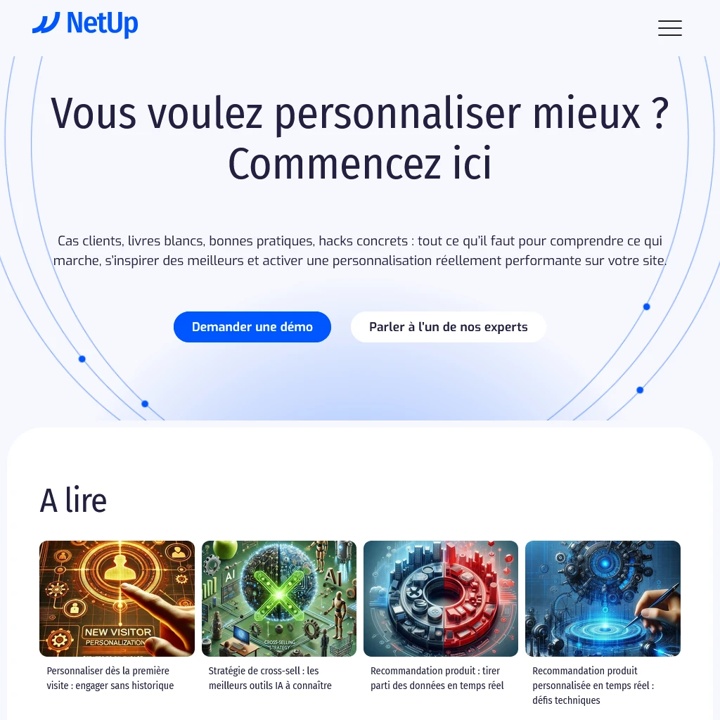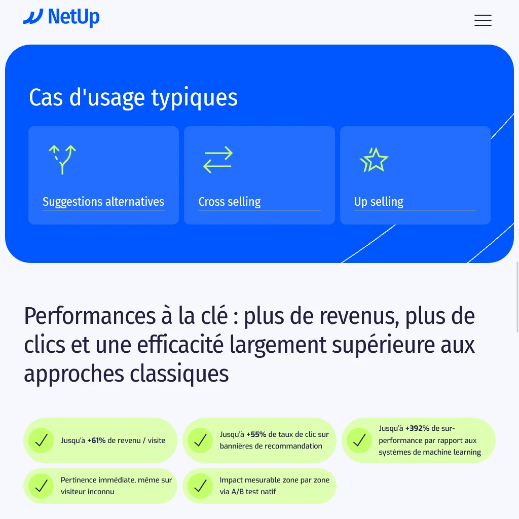 NetUp est une solution d’intelligence artificielle inductive qui permet aux entreprises de booster leur chiffre d’affaires en exploitant pleinement leur trafic web. Grâce à une analyse fine des parcours utilisateurs, NetUp identifie les intentions d’achat et active les bons leviers pour maximiser la conversion.